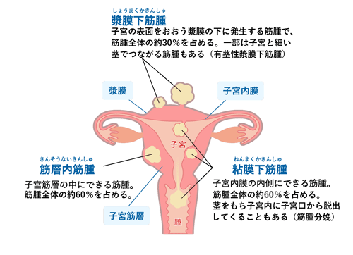子宮は外側から漿膜、子宮筋層、子宮内膜という3層構造になっています。筋腫がどの場所から発生するかによって、「漿膜下筋腫」「筋層内筋腫」「粘膜下筋腫」に分類されます。